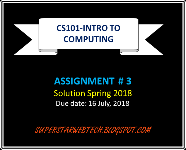 Dear Students, CS101- Introduction to Computing Assignment no 3 Solution has been uploaded for Semester Spring 2018. You can view it online or Download it. Assignment Solution is in Pdf format.Total Marks: 20