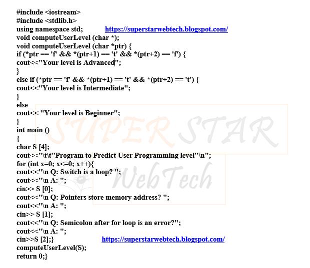 You have to create a function named computeUserLevel () and pass that array to this function and receive the array as pointer within the function declaration. The function will determine and print the result that whether you are a beginner, intermediate or advance level user. If a user is not able to correctly answer any of the questions then user level will be set as beginner.