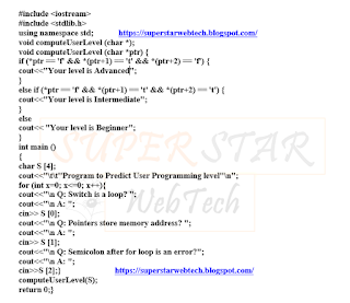 Write a program in C++ that will ask some programming related questions () from user and rank user according his / her answers in one of following categories: