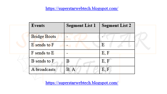 In a network, a bridge keeps the list of all the devices attached with the segment. The following figure shows computer A, B and C are connected to segment-1 and computer E, F and G are connected to segment-2.