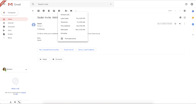 👉As you can see, all the text buttons/tabs have been replaced by icons which looks much more cleaner than before. On the screenshot, you can also view the new feature of Snooze email. The purpose of Snooze Email is that you can snooze your mail to reappear at a later time in your inbox. There must be configuration settings for these shortcuts (later, today, tomorrow, this weekend, next week and someday) as shown in the screenshot.