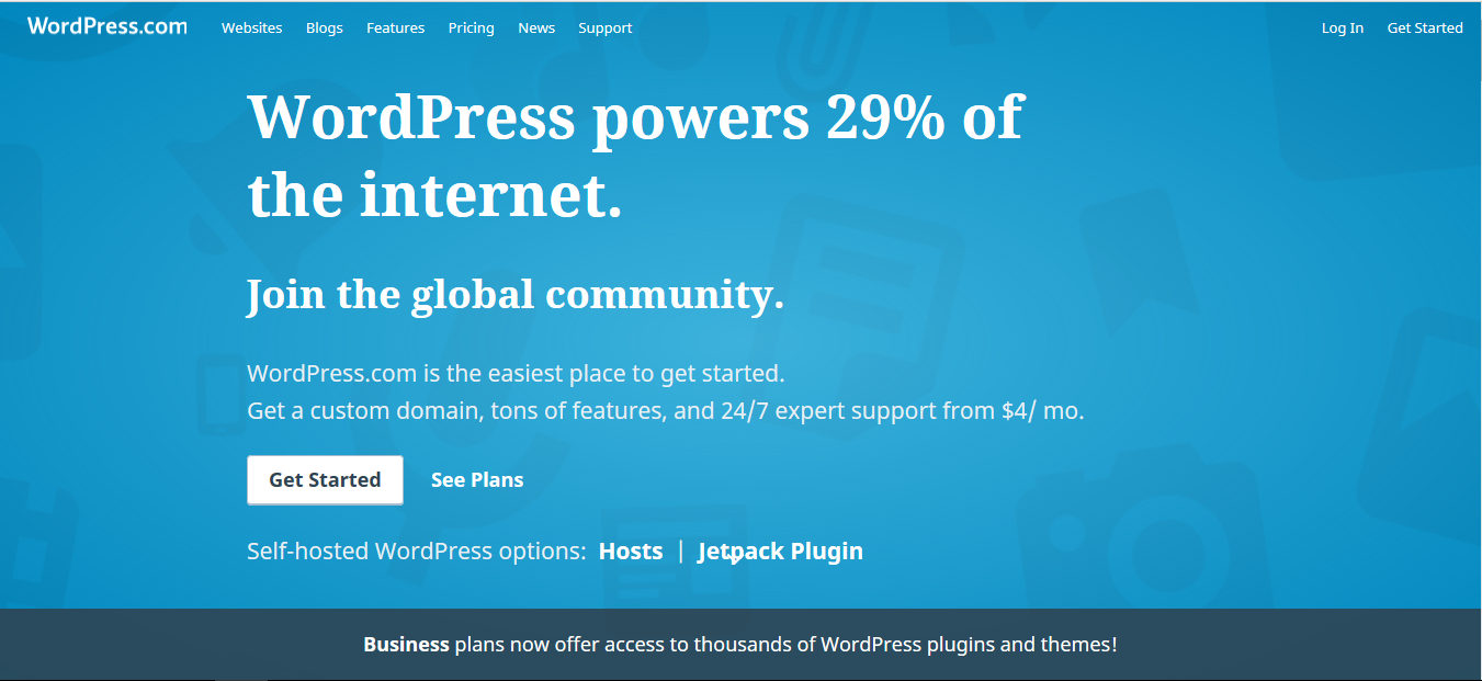 WordPress is a free, online, worldwide open source blogging platform. A content management system (CMS) written in PHP and MySQL. It is an easy to use platform. You have different kinds of themes to choose according to your topic. Its basic plan is free starting from $0 but you have to pay for premium ones. It provides two services i.e. online (WordPress.com) and self hosted(WordPress.org). Moreover, you can also buy additional services like custom domain name, extra storage. In comparison, wordpress.org has more features instead of wordpress.com.